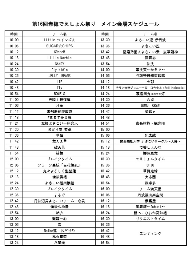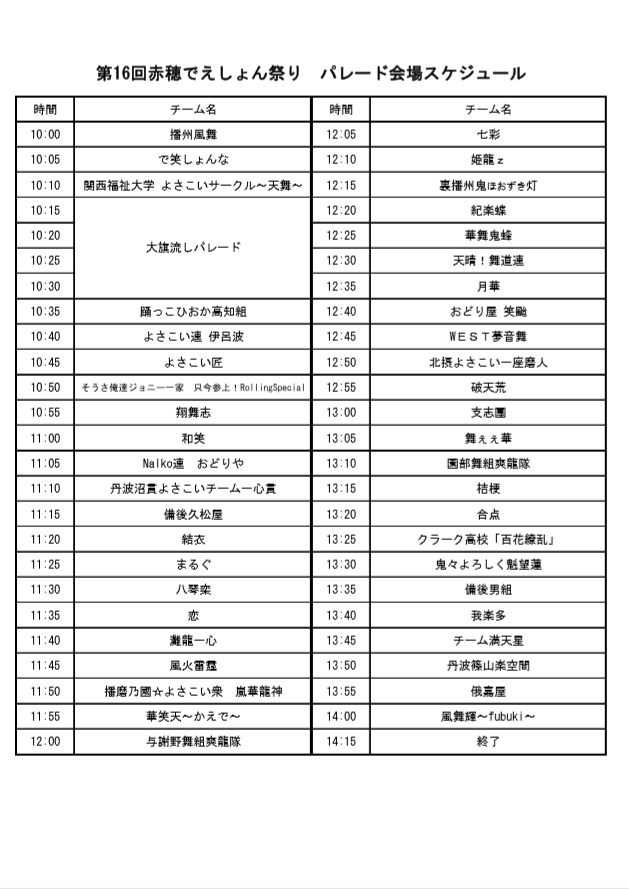 お知らせ タイムスケジュールが完成(^_-)-☆ 2019-10-07 2019-10-21 Facebook icon Twitter icon Hatena Bookmark icon Pocket icon Feedly icon LinkedIn icon Line icon 第16回赤穂でえしょん祭りタイムスケジュールが完成しました! 11月3日、晴れの赤穂で皆様のご来場をスタッフ一同お待ちしております。